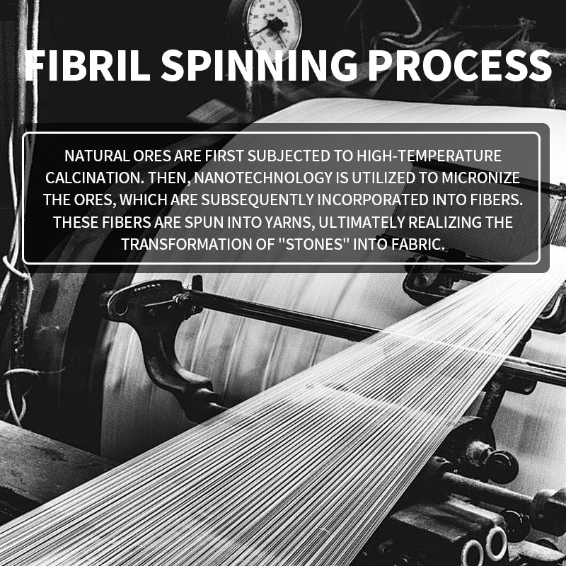 Natural ores are calcined at high temperatures and micronized using nanotechnology. The ore powder is integrated into the fibers and spun into yarn, essentially transforming 'stone' into fabric.