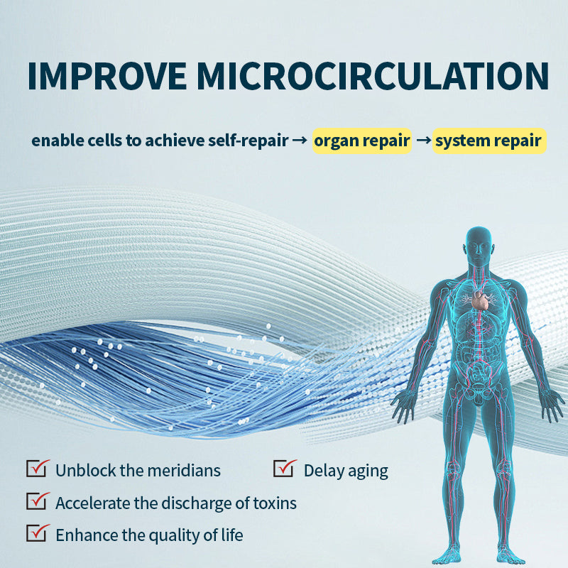 The herbal essences and mineral energy contained in the functional fibers work synergistically. They resonate harmoniously with the human body's bioelectric field, generating high-frequency vibration waves up to hundreds of millions of times per second. These high-frequency vibrations are imperceptible to humans but can rapidly improve microcirculation, unblock meridians, increase the flow rate and volume of microcirculation. This ensures all cells in the body receive sufficient oxygen and nutrients, allowing toxins to be expelled from the body and restoring the body's self-healing capabilities. It enables cells to achieve self-repair → organ repair → system repair, restoring a healthy constitution, delaying aging, enhancing longevity, and improving the quality of life.